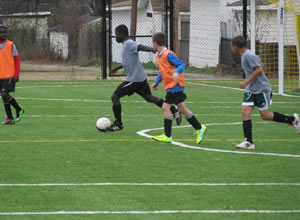 Three pair of goals are moveable to accommodate 2 different layouts. White lines designate three 65 foot futsal fields. Yellow lines demark one mini-soccer field used for 12 and under.